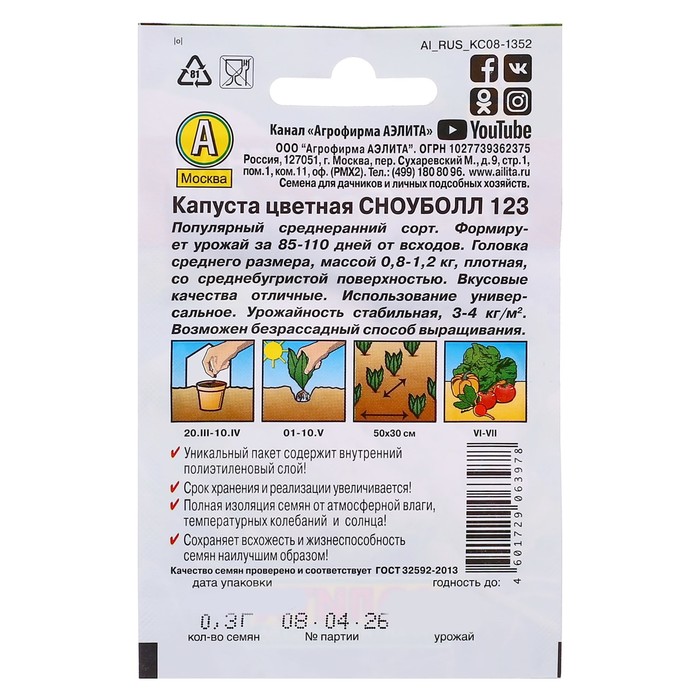 Семена Капуста цветная «Сноуболл 123», раннеспелая, 0.3 г, «Аэлита»