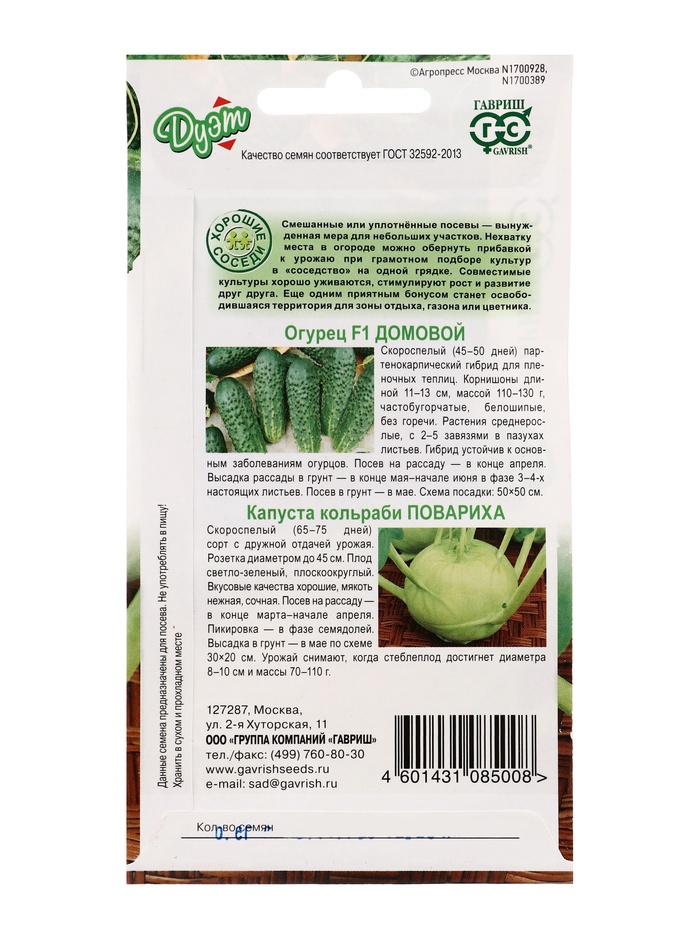 Семена Капуста кольраби «Повариха», 0.3 г + Огурец «Домовой», F1, 0.3 г, «Гавриш. Дуэт»