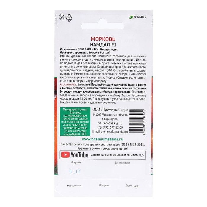 Семена Морковь "НамДал F1 (Bejo Zaden B.V. Нидерланды)", 0,1 г.