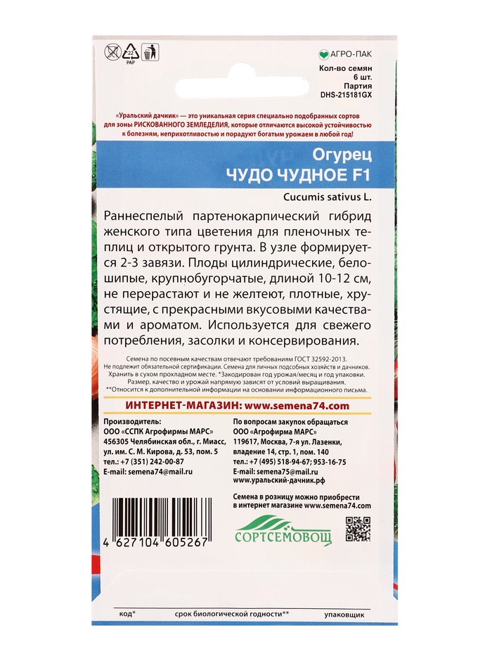 Семена Огурец Чудо чудное F1 (УД) Е/П , Е/П, 6 шт.