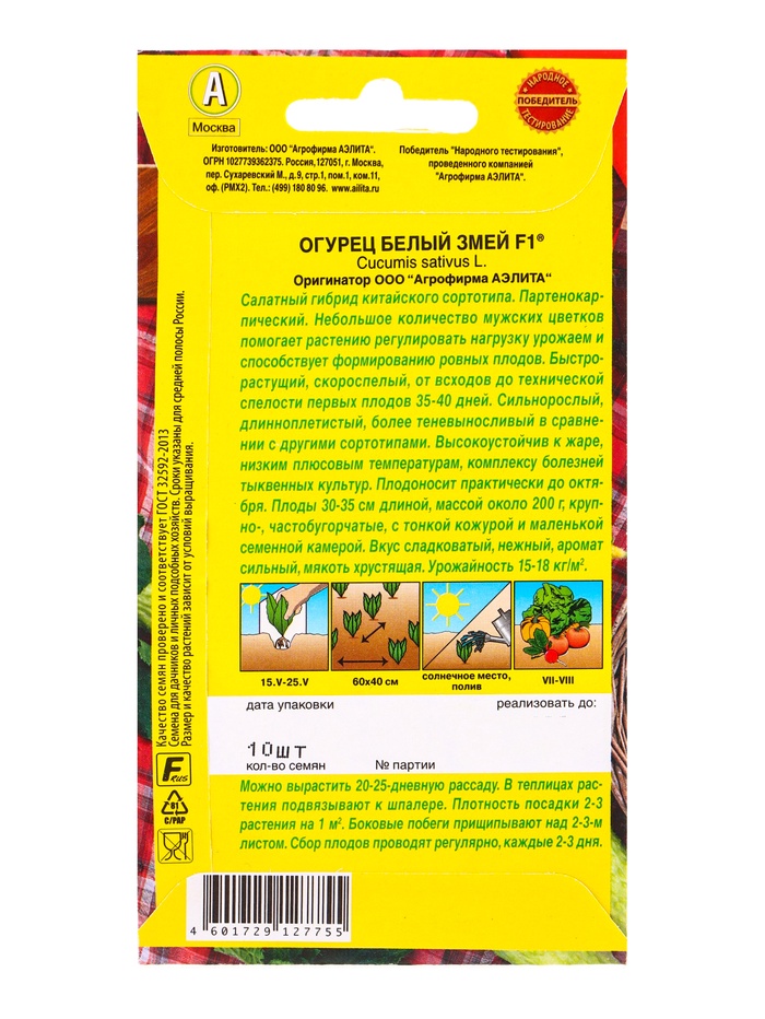 Семена Огурец китайский «Белый змей», F1, партенокарпический, 10 шт.