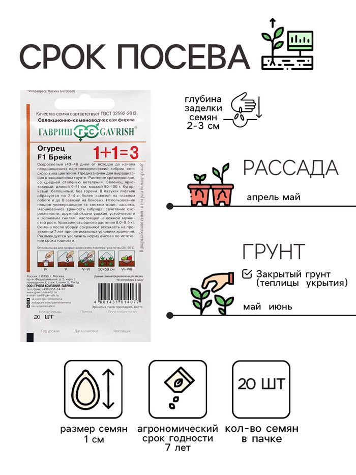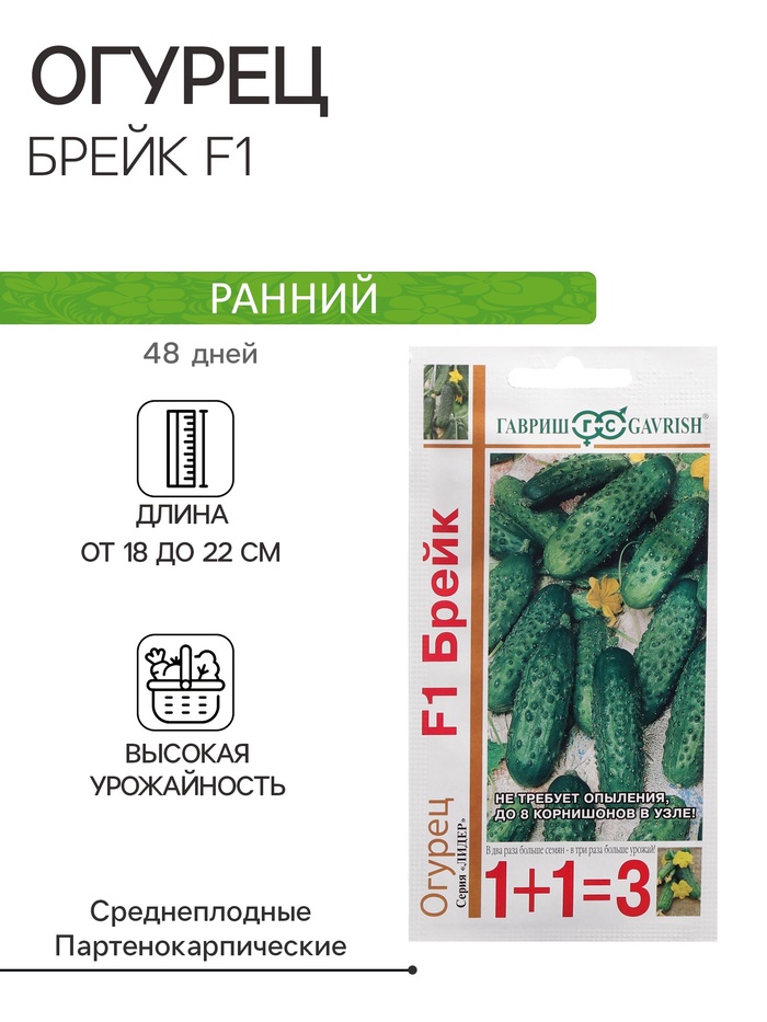 Семена Огурец корнишон "Брейк F1", серия 1+1, 20 шт