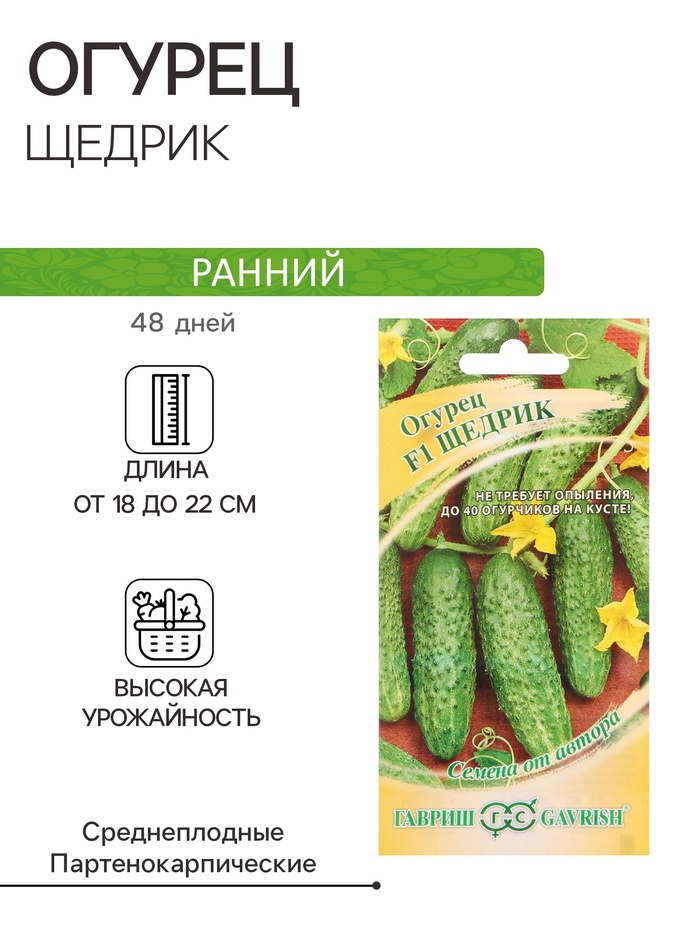 Семена Огурец "Щедрик" F1, пикуль, скороспелый, партенокарпический, 10 шт.