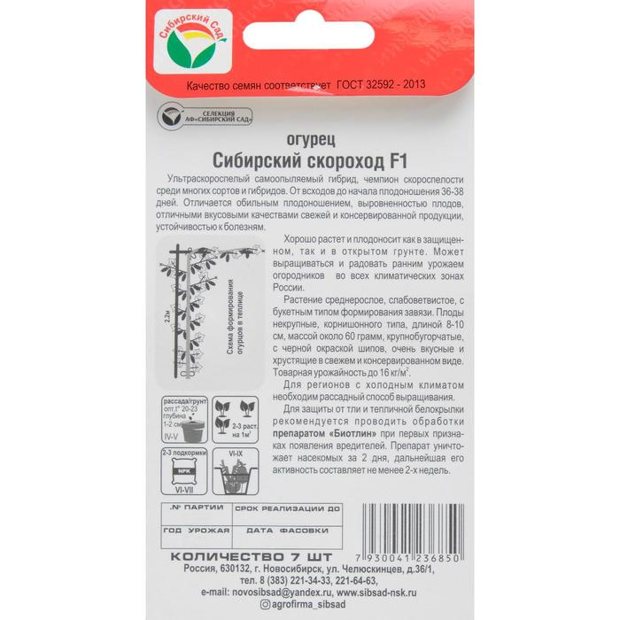 Семена Огурец "Сибирский скороход" F1, ультраскороспелый, партенокарпический, 7 шт