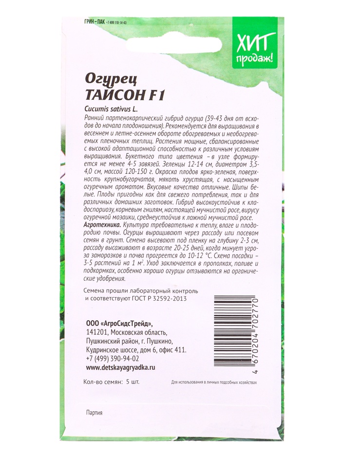 Семена Огурец Тайсон F1 5 шт