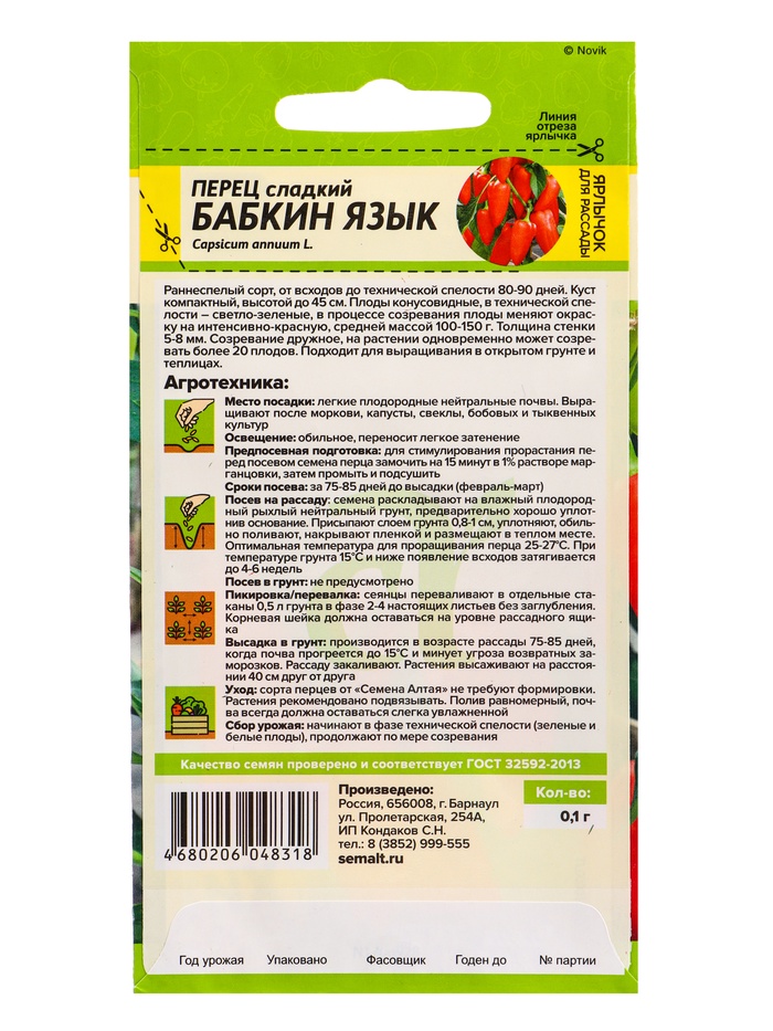 Семена Перец сладкий «Бабкин Язык», 0.1 г, «Семена Алтая»
