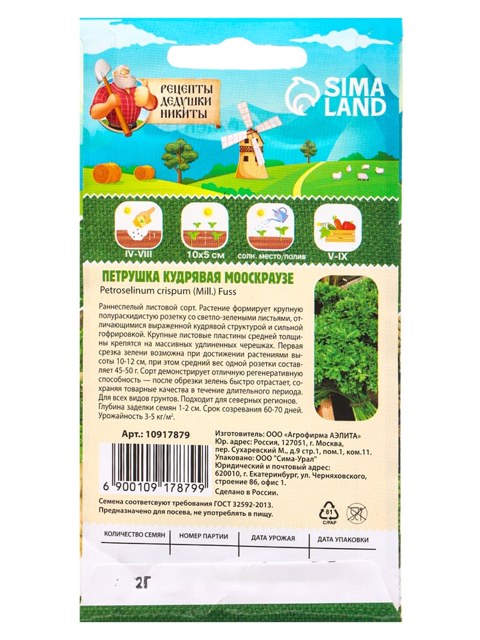 Семена Петрушка кудрявая «Мооскраузе», 2 г, «Рецепты дедушки Никиты»