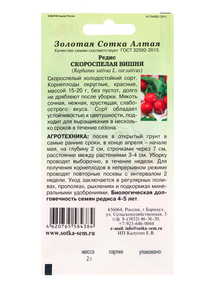 Семена Редис «Скороспелая Вишня», 2 г, раннеспелый «Золотая Сотка Алтая»