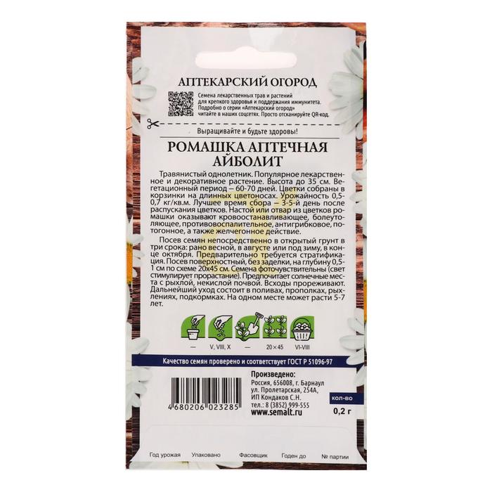 Семена Ромашка Аптечная "Айболит", ц/п, 0,2 г
