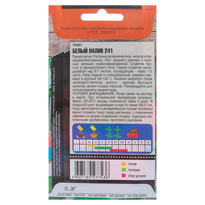 Семена Томат "Белый налив 241" раннеспелый, холодоустойчивый, 0,3 г