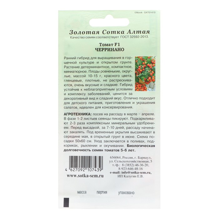 Семена Томат F1 «Черринано», ранний, 0.1 г, «Золотая Сотка Алтая»