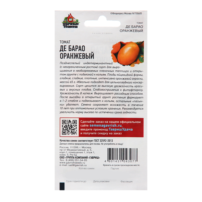 Семена Томат «Де барао», оранжевый, 0.05 г, «Гавриш»