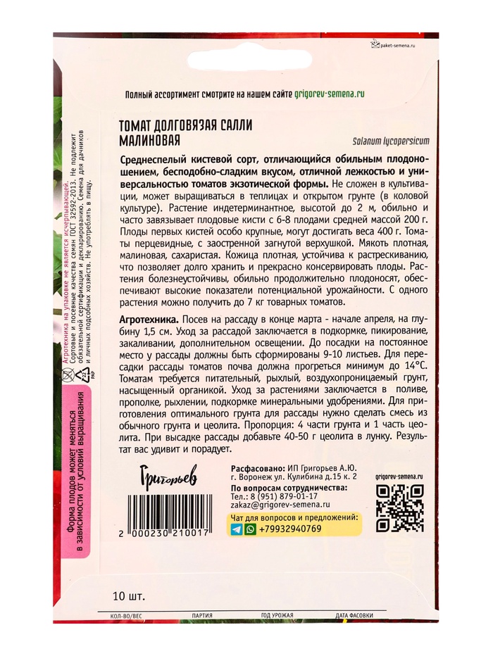 Семена Томат Долговязая Салли Малиновая 10шт. 12.29 г.