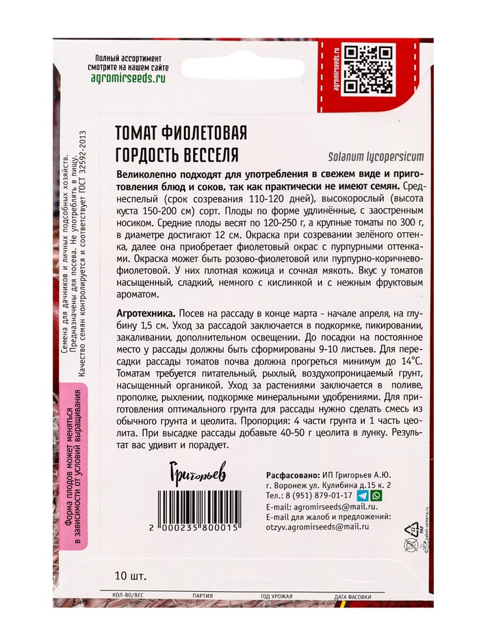 Семена Томат Фиолетовая Гордость Весселя 10шт. 12.29 г.