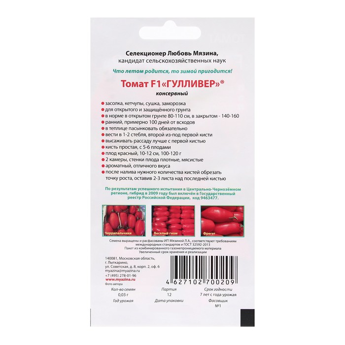 Семена Томат «Гулливер F1», 0.03 г, «Любовь Мязина»