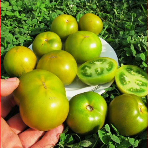 Зеленоплодный, ранний, высокоурожайный, непризотливый, низкорослый и очень вкусный томат для теплиц и открытого грунта. Вкус изысканный, яркий, запоминающийся. Помидоры оливкового цвета с шоколадным оттенком, масса 80-150 и более грамм. Плоды, в стадии зрелости желто-оранжевого цвета, сочные, сладковатые, от плоских до круглых, средней массой 100 грамм. Куст высотой около 70см, в период цветения весь усыпан цветами (более 100 на кусту), очень декоративно смртрится, однако завязывается лишь каждый третий. Формирование куста не требуется. Можно выращивать на подоконнике или на балконе. В теплице или парнике плодоносит до заморозков.