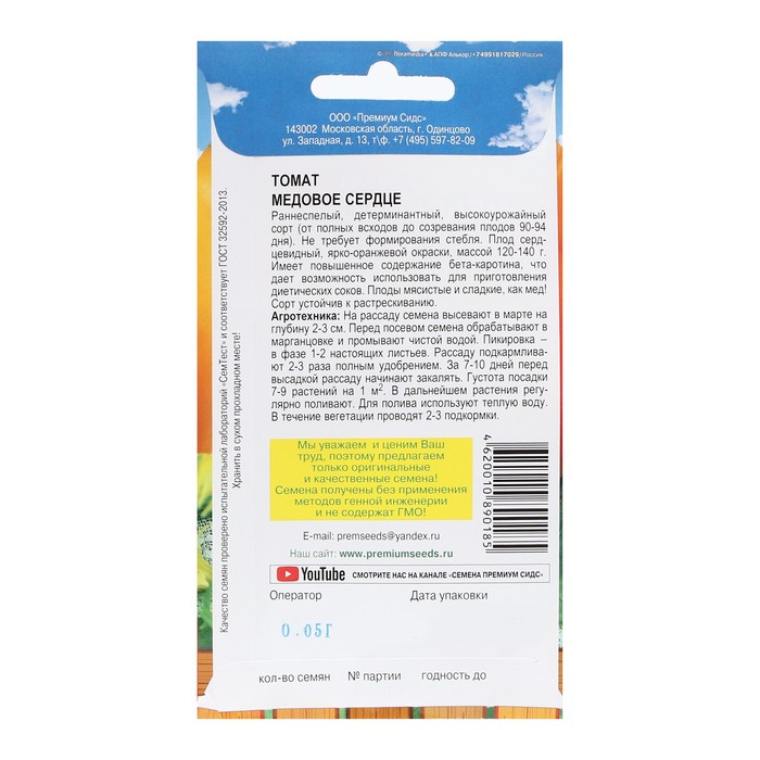 Семена Томат «Медовое сердце», раннеспелый, детерминантный, 0.05 г, Premium seeds