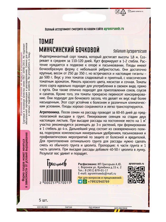 Семена Томат Минусинский Бочковой 5шт. 12.29 г.