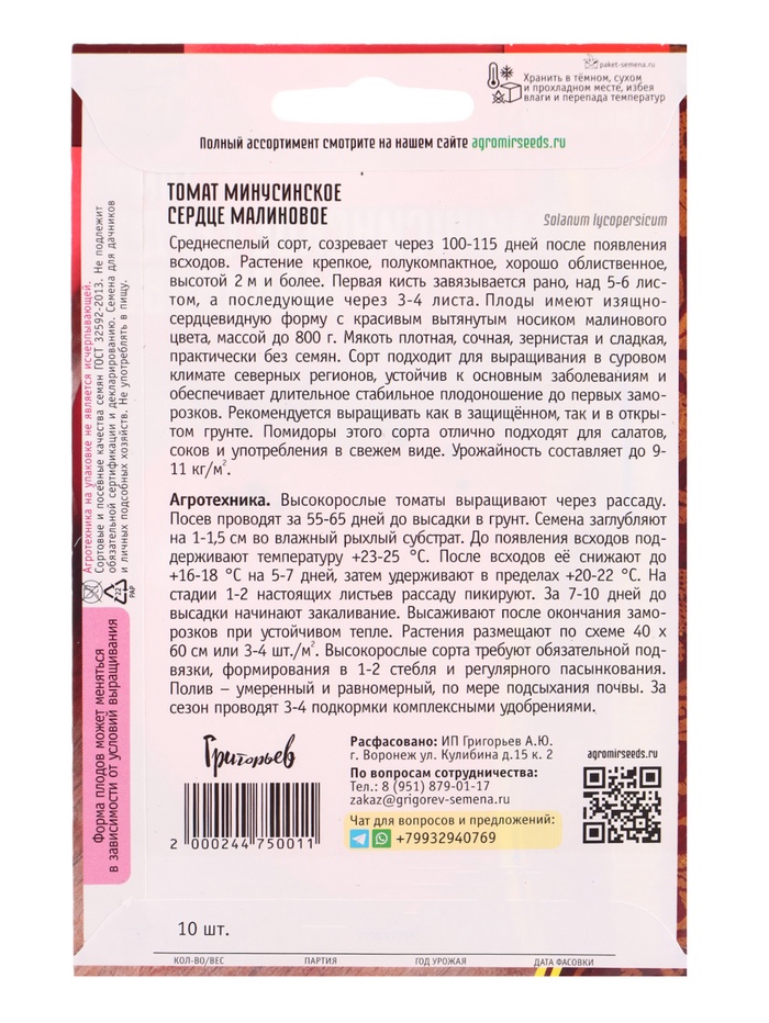 Семена Томат Минусинское Сердце Малиновое 10шт. 12.29 г.