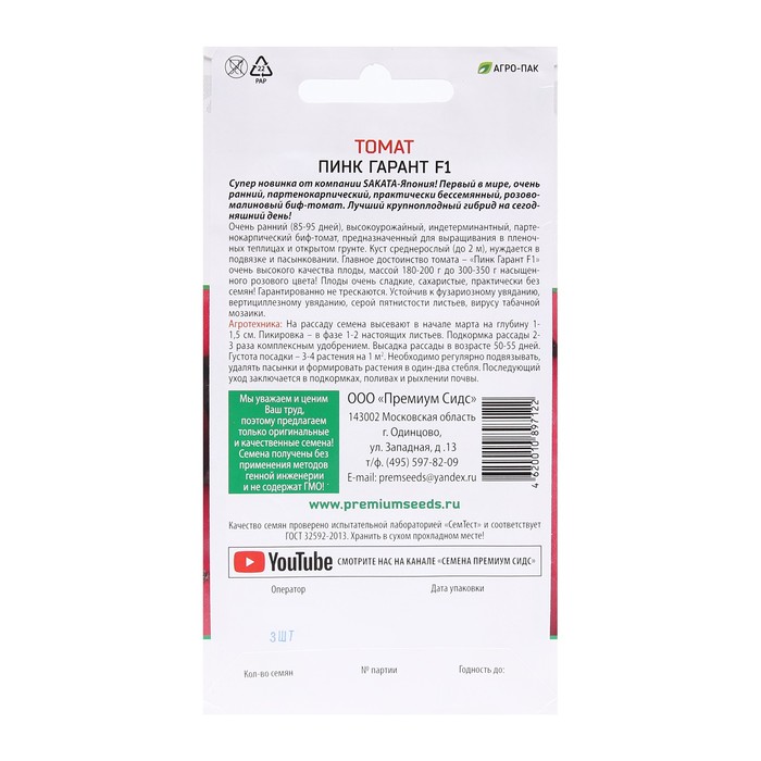 Семена Томат "Пинк Гарант", F1,индетерминантный,высокорослый, 3 шт