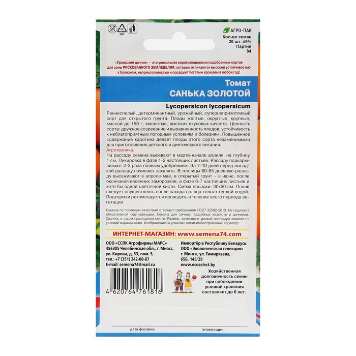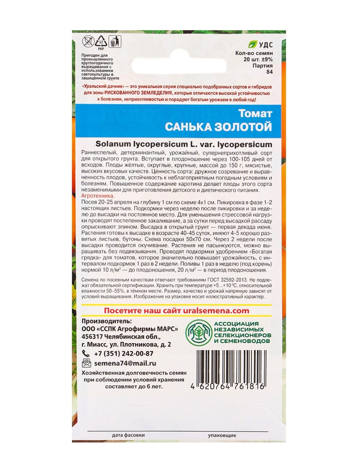 Семена Томат «Санька золотой», 20 шт., «Уральский Дачник»