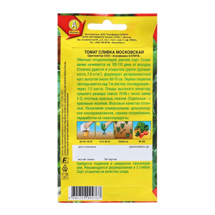 Семена Томат Сливка московская Ор. А Р Ц/П 0,2г