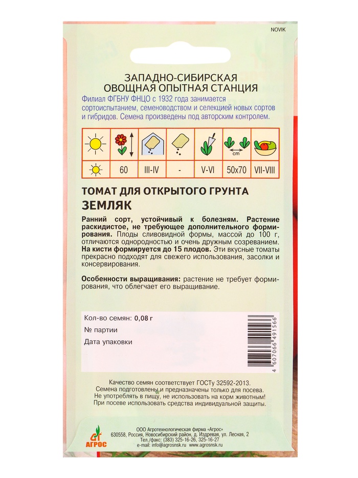 Семена Томат «Земляк», 0.08 г, «Агросс»
