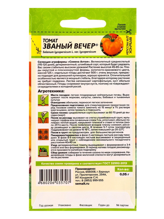 Семена Томат «Званый Вечер», среднеспелый, детерминантный, низкорослый, 0.05 г, «Семена Алтая»