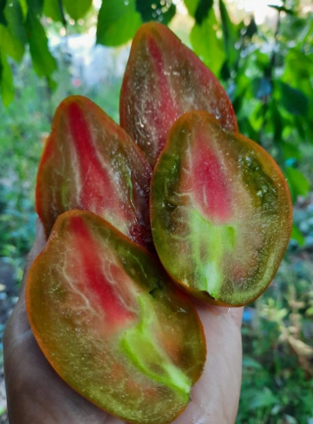 Высокорослый, среднеспелый, урожайный. Плоды в форме вытянутой сливы, крупные 250-300 гр. Снаружи плоды золотисто-бронзового цвета. В середине смешение зеленых желтых и розовых цветов. Вкус яркий, очень сладкий, деликатесный