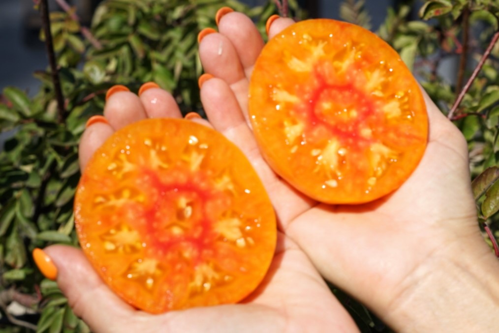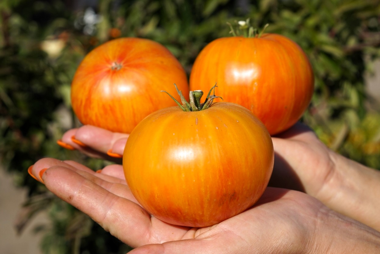 Высота в теплице до 1,2 м., в открытом грунте  0,8-1,0 м. Среднеранний. Форма —  плоскоокруглые бифштексы, со слегка ребристыми плечиками. Масса 200-300 грамм. Цвет ярко-желтый с более темными желтыми и розовыми полосками. Мякоть  желтого цвета с розовой мраморностью и сердцевиной. Сорт преимущественно салатного назначения. Вкус сбалансированный, мякоть плотная, ароматная.