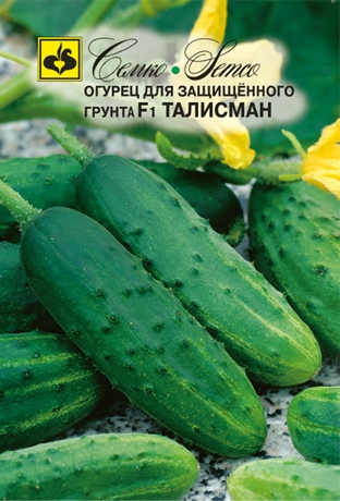 Огурец Талисман F1 - среднеранний партенокарпический гибрид для различных типов неотапливаемых теплиц, рекомендуется для весенне-летнего оборота. От всходов до начала плодоношения 50–55 дней. Плод длиной 10–12 см, массой 77–88 г, овальной формы, зеленый со слаборасплывчатыми короткими белыми полосами, черношипый, слаборебристый, редкомелкобугорчатый, без горечи, шейка короткая. Вкусовые огурцов качества отличные. Рекомендуется для потребления в свежем виде, пригоден для консервирования. Огурец Талисман F1 устойчив к мучнистой росе, относительно устойчив к ложной мучнистой росе. Урожайность 11–14 кг/м.
