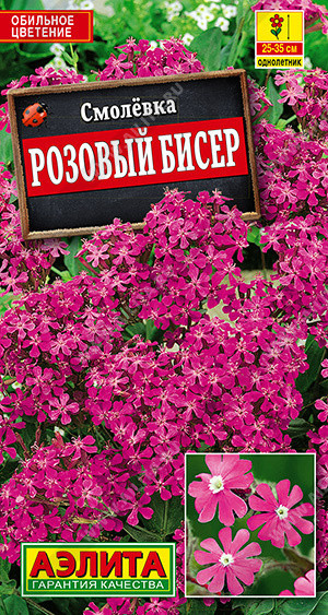 Ценный однолетник с обильнейшим цветением. Изящные пятилепестковые цветочки имеют размер не более 2 см, но их так много, что листвы не видно и растение похоже на яркий шарик. Цвет настолько яркий, что цветоводы называют его флуоресцентным. Обычно яркие цвета утомляют глаз, но цветение смолевки Розовый бисер кажется легким и не раздражительным. Растение формирует густой компактный куст высотой 25-35 см. Растет быстро – к июлю удается получить сплошной цветущий ковер. Кустики украсят цветники открытого грунта и балконные ящики.