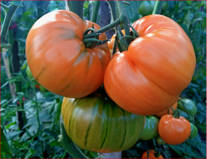 Среднеранний индетерминантный сорт. Высота в теплице до 200 см. Помидоры плоскокруглой пышной формы. Плоды ярко-абрикосового цвета.  Масса до 500 грамм. В жаркий сезон 2021, куст выдал несколько плодов до 1000 гр. Мякоть плотная, цвета манго. Насыщенный сладкий вкус с фруктовыми нотками,  немного приятной кислинки.