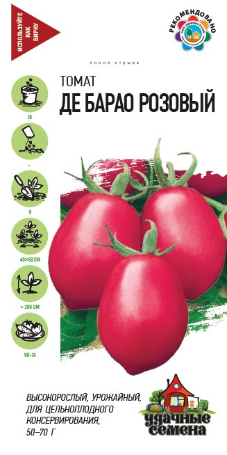 Среднеспелый (115-120 дней от всходов до плодоношения) высокорослый сорт для пленочных и остекленных теплиц или для выращивания в открытом грунте (в более южных регионах). Растение среднерослое, средневетвистое, высотой более 2 м. Требует подвязки и пасынкования. Плод овальный, плотный, окраска незрелого плода зеленая, с темным пятном, зрелого — розовая. Масса плода 50-70 г. Вкус отличный. Товарная урожайность до 5,4-6,8 кг/кв.м. Слабо поражается фитофторозом. Ценится за высокую урожайность, хорошие вкусовые и технологические качества плодов. Рекомендован для употребления в свежем виде и цельноплодного консервирования.