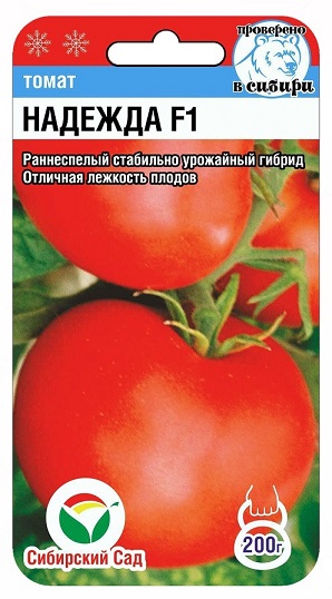 Гибрид Надежда F1 раннеспелый (от всходов до начала созревания плодов 95-98 дней). Растение детерминантное, высотой 100-130 см. Плоды плоскоокруглые, плотные, массой до 200 г, не растрескиваются, сохраняют товарные качества до 1,5 месяцев после сбора, очень вкусные. Гибрид обладает комплексной устойчивостью к болезням томата. Отличается стабильной урожайностью до 16-18 кг с 1 кв. м. Рекомендуется для выращивания в открытом грунте и пленочных теплицах