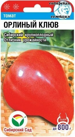 Среднеспелый сорт сибирских селекционеров с крупными плодами весом до 800 г необычной клювовидной формы. Рекомендуется для выращивания в открытом и защищенном грунте. Растение среднерослое, в зависимости от условий выращивания высотой от 1,2 до 1,5 м, требует подвязки и умеренного пасынкования. Плоды малиново-розового цвета, вкусные, формой напоминают мощный изогнутый клюв орла. Мякоть малосеменная и очень плотная, что обеспечивает хорошую лежкость и высокие засолочные качества плодов. По урожайности (до 6-8 кг с растения) данный сорт можно назвать одним из лучших среди крупноплодных томатов. В первой фазе плодоношения плоды особо крупные, весом до 800 г, последующие средние, массой 200-400 г.