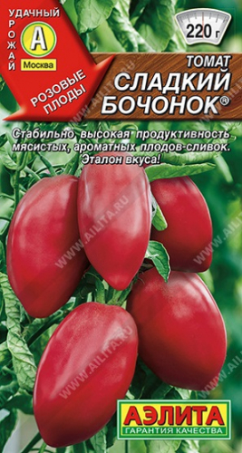 Раннеспелый низкорослый (35-40 см) детерминантный сорт. Плоды красные, сливовидной формы, массой 80-100 г, используются в свежем виде, но особенно хороши для цельноплодного консервирования. Выращивается в 2-3 стебля, возможно без пасынкования, в открытом грунте. Ценность сорта - раннеспелость, стабильная продуктивность, оригинальная сливовидная форма и непревзойденные засолочные качества плодов. Сорт устойчив к неблагоприятным погодным условиям. Сорт хорошо реагирует на полив и подкормки комплексными минеральными удобрениями.