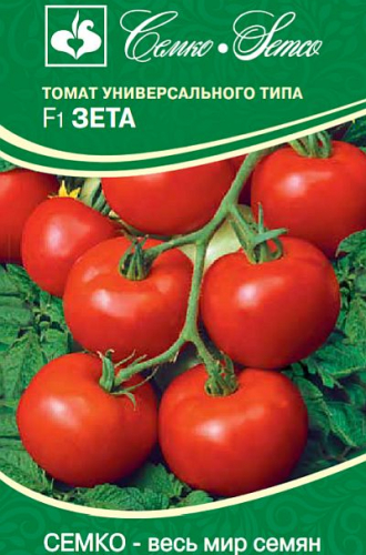 Томат Зета F1 - ранний гибрид для открытого грунта и пленочных теплиц. От всходов до начала созревания 90–95 дней. Растение высотой 60-70 см, среднеоблиственное. Первая кисть закладывается над 5-6 листом, последующие через 1-2 листа. Кисть простая с 5–6 плодами. Плод округлый, гладкий, плотный, массой 130-150 г, в технической фазе спелости зеленовато-белёсый, в биологической красный, без зелёного пятна у плодоножки. Отличается высокой дружностью плодоношения, в первые две недели созревают более 40% плодов. Вкусовые качества высокие. Товарность и транспортабельность хорошая. Томат Зета F1 устойчив к вирусу томатной мозаики (ToMV), вынослив к альтернариозу (Acs), фузариозу (Fol 1-2) и фитофторозу (Pi). Отличается устойчивостью к повышенному засолению почвы. Используется для свежего потребления, консервирования и засолки. Рекомендуется для выращивания в открытом грунте и плёночных необогреваемых теплицах. Схема посадки 70х30 см. Урожайность в открытом грунте свыше 10 кг/м2, в плёночной теплице 17–20 кг/м2.
