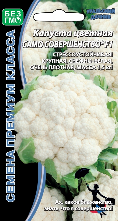 Раннеспелый, высокоурожайный, стрессоустойчивый гибрид, легко адаптирующийся к погодным катаклизмам. Головка округло-плоская, полностью покрыта листьями, плотная, белоснежная, массой до 1,5 кг. Вкусовые качества отличные. Гибрид устойчив к болезням, рекомендуется для употребления в свежем виде и переработки. АГРОТЕХНИКА: Цветная капуста очень требовательна к питанию и влаге, не выносит кислых почв. Посев на рассаду проводят в середине марта. Через 7-10 дней после появления всходов сеянцы пикируют. Рассада готова к посадке через 35-40 дней после всходов. Сажают ее в конце апреля, по схеме 35х50 см. Дальнейший уход заключается в поливе, прополке, рыхлении и регулярной подкормке. Обязательно притенение головок: 2 листа надламывают или связывают над головкой (чтобы она сохранила белый цвет и не распадалась). В южных регионах можно высевать семена капусты непосредственно в грунт.