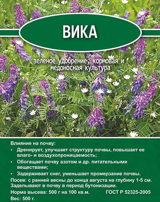 Вика — однолетнее растение семейства Бобовые, на корнях которой находятся колонии бактерий — азотфиксаторов, поэтому сильно обогащает почву азотом. Корни вики уходят глубоко в почву, хорошо рыхлят грунт, а благодаря своей холодостойкости, её можно сажать в самые ранние сроки.