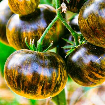 Плоды выделяет и отличает от других сортов необычная окраска: чернильные полоски и плечи на изумрудном фоне появляются сразу после формирования завязи. При созревании фиолетовые штрихи сохраняются, а низ томата окрашивается в цвета охры. Спелый плод на разрезе темно-зеленый, с ароматной сладкой мякотью, имеющей тонкие нотки медового и цитрусового оттенков.