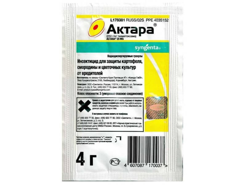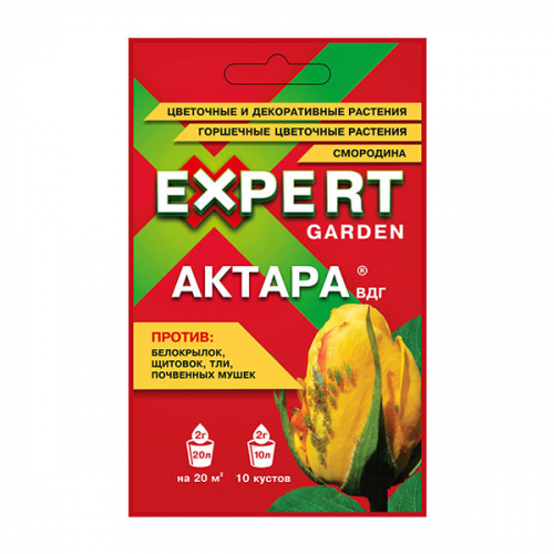 Назначение: АКТАРА, ВДГ, инсектицид кишечно-контактного действия, предназначен для защиты картофеля от колорадского жука; смородины от тли; цветочных культур от тли, белокрылки, трипса и щитовок. Инсектицид применяют как для опрыскивания растений в период вегетации, так и для внесения в почву. При внесении в почву обладает выраженной системной активностью. Рекомендации по применению в личном подсобном хозяйстве: На картофеле для защиты от колорадского жука АКТАРА, ВДГ применяется в норме расхода 0,6–0,8 г препарата на 1 сотку, при расходе воды 5 литров на сотку. Одной упаковки 4 г достаточно для обработки 5,0–6,7 соток картофеля. Период защитного действия составляет от 3-х до 4-х недель. При правильном применении достаточно одной обработки для защиты от одного поколения колорадского жука. АКТАРА, ВДГ обладает хорошей дождеустойчивостью. Если дождь прошел через 2 часа после обрабоки картофеля инсектицидом АКТАРА, ВДГ, то повторную обработку проводить нет необходимости. АКТАРА, ВДГ проникает внутрь листьев растений, что способствует длительной и эффективной защите независимо от погодных условий. В то же время, препарат не проникает в клубни картофеля. На смородине для защиты от тли, в частности от листовой красногалловой тли, рекомендуется проводить опрыскивание до начала цветения, при появлении листьев. Вторую обработку следует проводить в конце сезона. Норма расхода препарата 2 г на 10 л воды, 10 л рабочего раствора на 40 кустов смородины. АКТАРА, ВДГ хорошо зарекомендовала себя в защите горшечных и цветочных культур от тли, белокрылки, щитовок и ложнощитовок. Для защиты горшечных цветочных растений при опрыскивании следует растворить 4 г препарата в 5 л воды, расход рабочей жидкости — 2 л/100 м2. На цветочных и декоративных культурах для защиты от тли и белокрылки 4 г препарата разводят в 8 л воды. Этого количества достаточно для обработки 80 м2. Против трипса 4 г препарата следует растворить в 5 литрах воды. Этого количества достаточно для обработки 50 м2. Инсектицид АКТАРА, ВДГ может применяться не только методом опрыскивания, но и путем внесения в почву вместе с поливом. Так на горшечных цветочных растениях для защиты от тли, белокрылки, трипса, щитовок и ложнощитовок препарат можно применять методом полива почвы под растениями. При поливе норма расхода препарата составляет 1г/10 л воды, при высоте растений до 40 см. Норма расхода рабочей жидкости — 10 л/10 м2 (250 горшков). Для защиты от проволочника 4 г инсектицида АКТАРА, ВДГ следует растворить в 10 л воды и равномерно пролить борозды (лунки) при посадке клубней. Расход рабочего раствор 10 л на 100 погонных метров. Внесение инсектицида АКТАРА, ВДГ в почву при посадке картофеля позволяет полностью отказаться от опрыскивания картофеля в период вегетации от колорадского жука. Для защиты капусты от капустной мухи следует пролить капустную рассаду в кассетах (горшочках) за 1–2 дня до высадки рассады в грунт. 4 г препарата следует растворить в 2 л воды. Этого количества достаточно для обработки 0,7 м2 рассадной площади. Не следует допускать переувлажнения почвы. Порядок приготовления рабочей жидкости (ЛПХ): работы по приготовлению рабочей жидкости следует проводить на открытом воздухе. Для удобства готовится маточный раствор: содержимое пакета растворяют в 1 л воды, используя для этого емкость большего объ