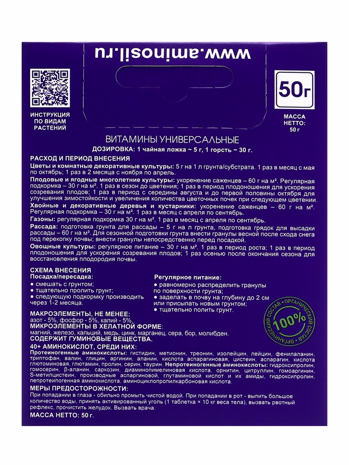 * Экономичный расход: Упаковки в 50 г достаточно на длительный период использования, что делает его идеальным для регулярного ухода за растениями в любых условиях.