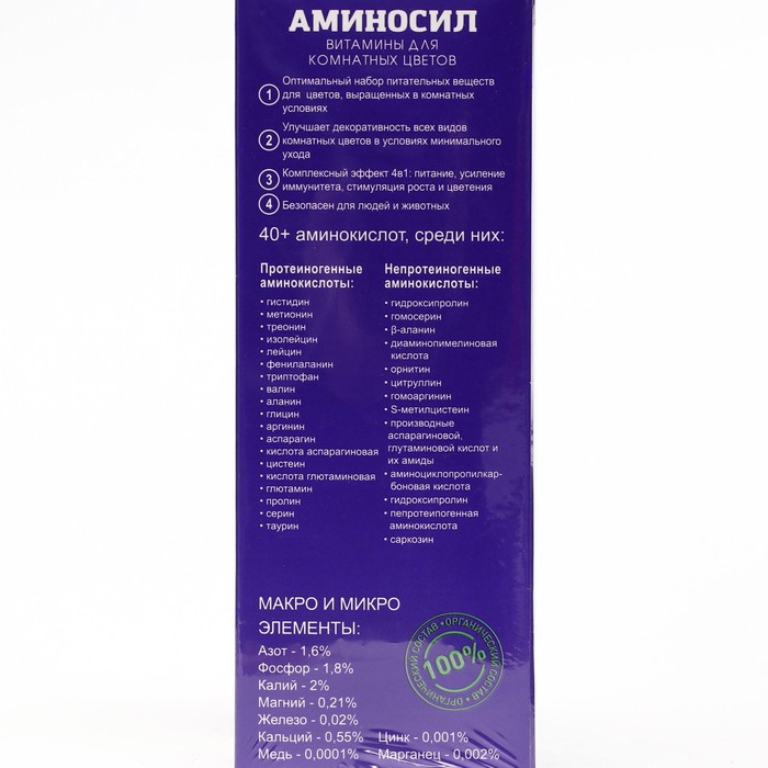 Витамины Аминосил для комнатных цветов это специально разработанный комплексный продукт, который способен обеспечить все необходимые элементы питания для здорового и красивого роста самых разных комнатных растений. Удобрение содержит все важные макро и микроэлементы, которые способны улучшить здоровье и красоту, а также ингредиенты, которые способствуют более интенсивному и длительному цветению. Поможет укрепить корневую систему и улучшить общее состояние растений. Макро и микроэлементы. 40+ аминокислот. Рекомендуется использовать в течение всего периода роста и цветения. Это позволяет достичь максимального результата и обеспечить вашим комнатным растениям все необходимые элементы питания. Если вы хотите обеспечить здоровый и красивый рост своих растений, то удобрение для комнатных цветов - это идеальный выбор для вас. Оно подходит для ухода за самыми разными растениями и поможет создать прекрасный оазис красоты и здоровья в вашем доме. Жидкая подкормка для домашних балконных комнатных цветов (чайная бенгальская полиантовая роза, фиалки орхидеи бегонии).5 мл витаминного концентрата Аминосил разбавить в 1 л воды до образования однородного раствора.Вариант 1: поливать почву и растение получившимся раствором ближе к основанию до полного намокания грунта.Вариант 2: опрыскивать растение получившимся раствором до полного смачивания листьев или протирать листья смоченной раствором салфеткой. Избегать попадания на бутоны и лепестки цветов.Периодичность: подкармливайте растения 1 раз в 2 недели (с мая по октябрь) и 1 раз в 4 недели (с ноября по апрель).Оптимальный набор питательных веществ для всех цветов, выращенных в комнатных условиях;Улучшает декоративность* всех видов комнатных цветов в условиях минимального ухода;Комплексный эффект 4 в1: питание, усиление иммунитета, стимуляция роста и цветения;