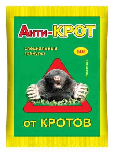 Для тех, кто твердо намерен избавится от кротов на своем участке, разработан уникальный препарат — специальные гранулы «Анти-КРОТ». Состав этой приманки подобран с учетом пищевых предпочтений крота, запах и вкус очень привлекательны для него. Специальная технология изготовления и включение в состав сильного действующего вещества гарантируют высокую эффективность в борьбе с кротом.