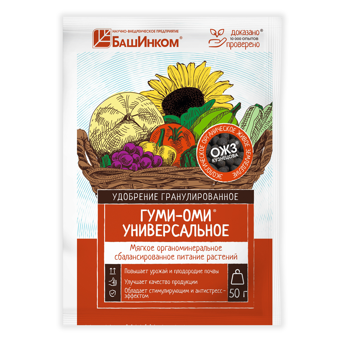 БашИнком Гуми-Оми Универсальное– органоминеральное гранулированное удобрение для сбалансированного питания растений. Удобрение мощно повышает урожайность и плодородие почвы за счет органических и минеральных составляющих, укрепляет иммунитет растения, обеспечивает продолжительное и обильное цветение, нейтрализует действие пестицидов, улучшает экологическую чистоту урожая, обладает пролонгированным действием.Преимущества:• повышает урожай;• улучшает структуру и плодородие почвы;• обладает стимулирующим и антистресс-эффектом.