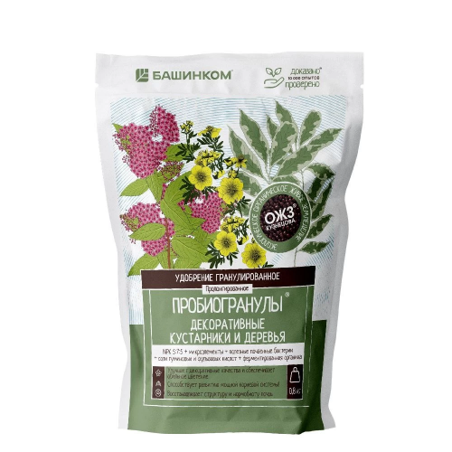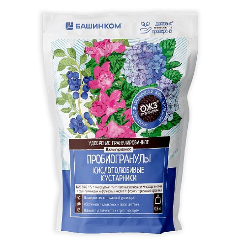 БашИнком Пробиогранулы для кислотолюбивых кустарников– мягкое органоминеральное удобрение пролонгированного действия для личных подсобных хозяйств. Каждая гранула содержит в идеально подобранном соотношении макро- и микроэлементы (в легкодоступной хелатной форме), необходимые кислотолюбивым растениям: голубика, гортензия, азалия, рододендрон, вереск, калина, хвойные, папоротник и другие. Наличие активного компонента серы обеспечивает оптимальный уровень кислотности субстрата и способствует быстрому и лёгкому усвоению питательных веществ.Преимущества:• поддерживает оптимальный уровень рН;• обеспечивает длительное и яркое цветение;• повышает устойчивость к стрессовым факторам.