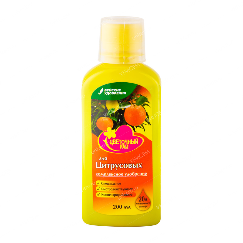 Буйские удобрения Цветочный рай для цитрусовых– жидкое концентрированное комплексное удобрение. Применяется в качестве корневой подкормкидляцитрусовых растений. Препарат способствует здоровому росту и развитию, стимулирует обильное цветение и плодоношение, придает растениям красивый внешний вид, повышает устойчивость растений к болезням, вредителям и неблагоприятным условиям внешней среды.• Удобрение содержит полный комплекс веществ, необходимых для полноценного и сбалансированного питания растений.
