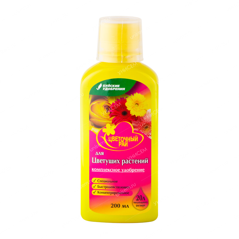 Буйские удобрения Цветочный рай для цветущих комнатных и садовых растений– жидкое концентрированное комплексное удобрение. Применяется в качестве корневой подкормки для цветущих комнатных и садовых растений. Препарат способствует здоровому росту и развитию, стимулирует развитие побегов и листового аппарата, обеспечивает полноценное и длительное цветение, придает растениям красивый внешний вид, повышает устойчивость растений к болезням, вредителям и неблагоприятным условиям внешней среды.• Удобрение содержит полный комплекс веществ, необходимых для полноценного и сбалансированного питания растений.