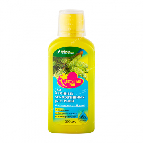 Буйские удобрения Цветочный рай для хвойных декоративных растений– жидкое концентрированное комплексное удобрение. Применяется в качестве корневой и внекорневой подкормки для всех хвойных декоративных растений. Препарат способствует здоровому росту и развитию, придает растениям красивый внешний вид, повышает устойчивость растений к болезням, вредителям и неблагоприятным условиям внешней среды.• Удобрение содержит полный комплекс веществ, необходимых для полноценного и сбалансированного питания растений.